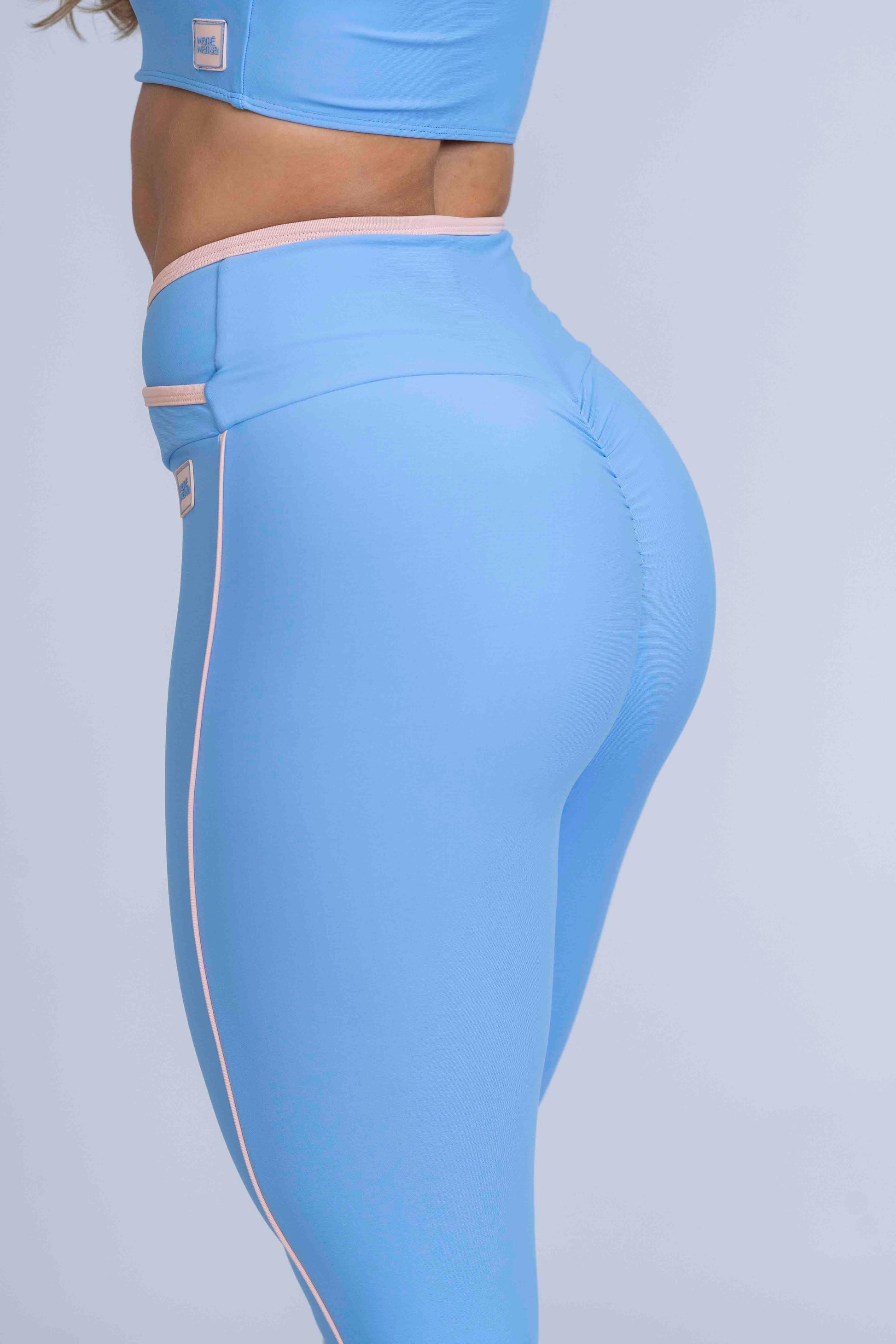 Adquira agora a Calça Legging Fitness Julia Azul Serenity com Viés Rosa Lily e experimente a combinação perfeita de estilo, conforto e inovação da Maré Maria!