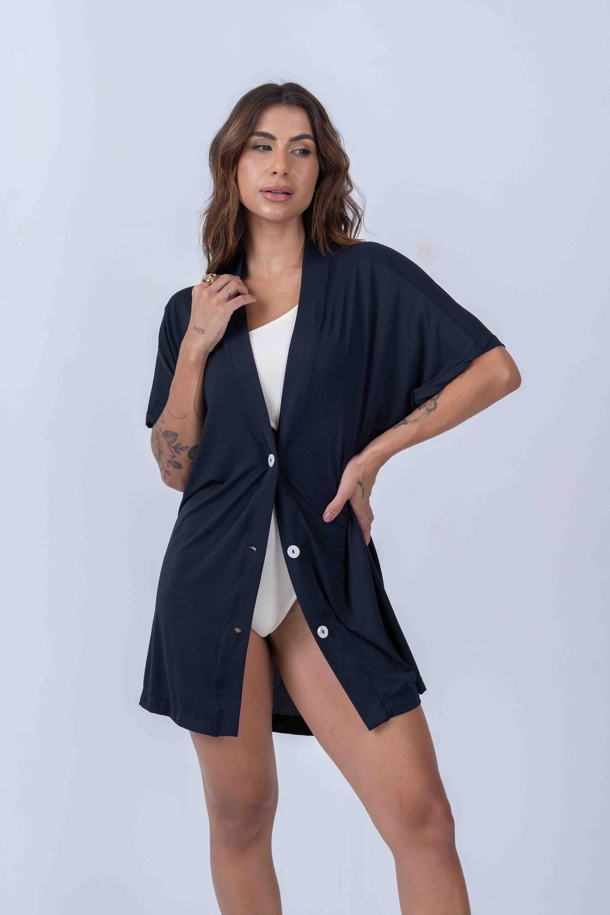 O Kimono saída de praia Preto é a peça perfeita para compor um visual sofisticado e funcional, sendo ideal como saída de praia ou piscina. Com seu design minimalista e moderno, ele possui um recorte reto que oferece caimento leve e elegante, além de botões frontais trabalhados que adicionam um toque de estilo e praticidade à peça.