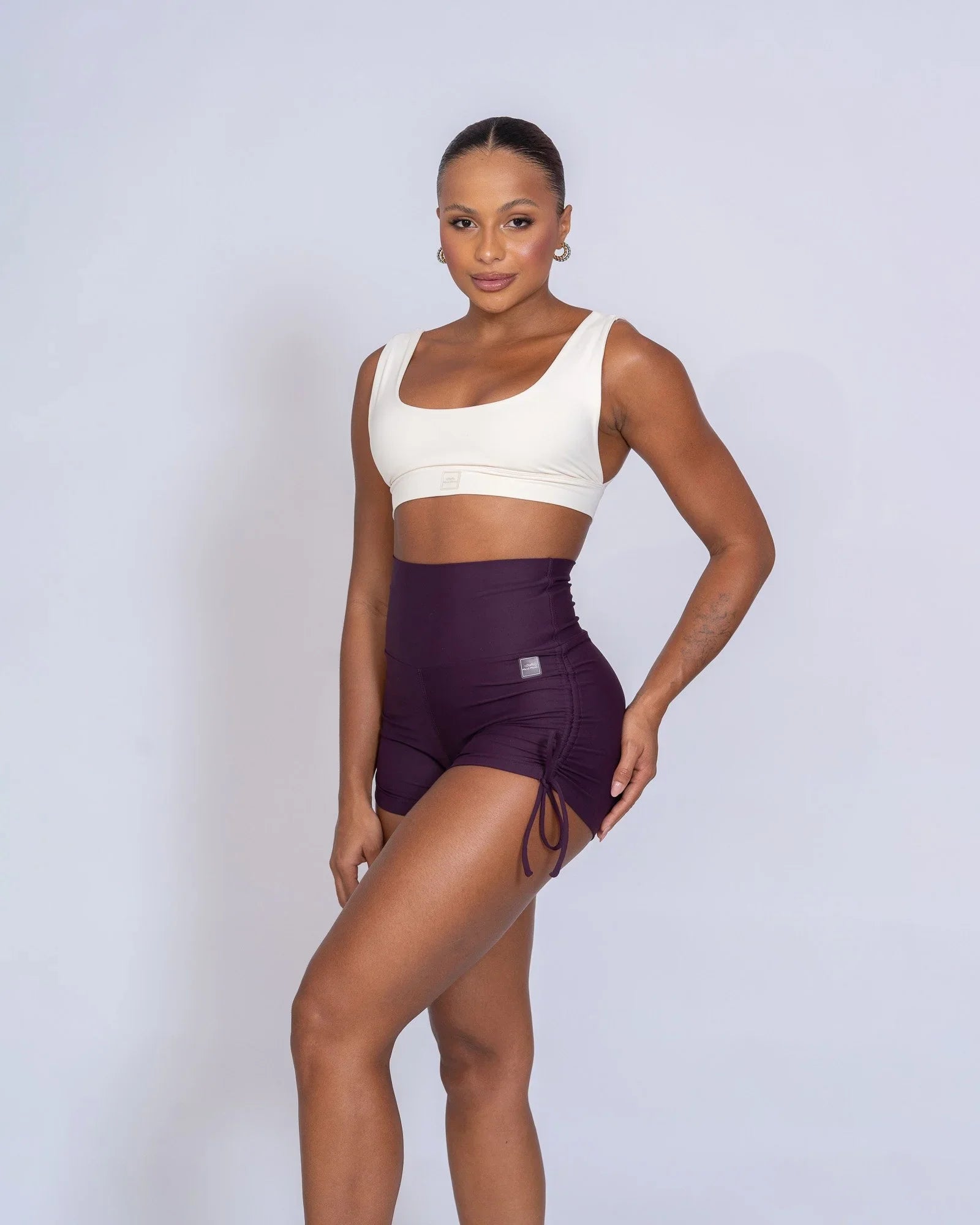 - Estilo: Top de academia com recorte lateral decotado, decote em "U" fechado nas costas.