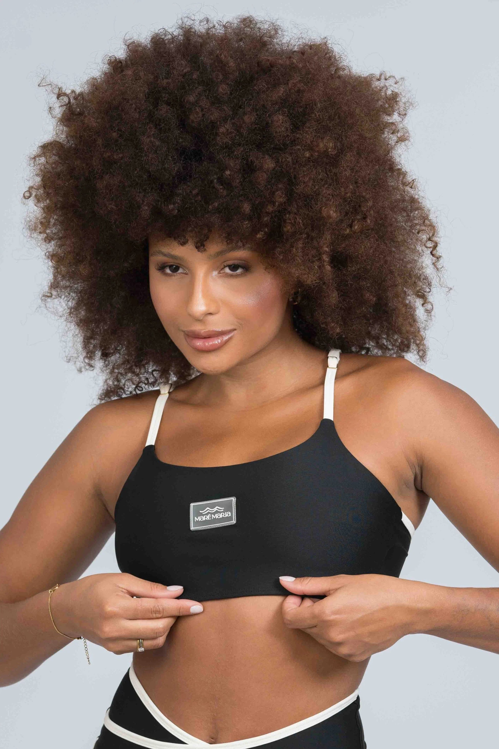 🔺 Logo Emborrachada Maré Maria: Aplicada com discrição no busto para acabamento sofisticado
